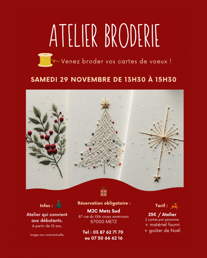 À l’approche des fêtes, la MJC Metz Sud vous propose un atelier broderie spécial Noël pour créer des cartes de vœux uniques et personnalisées. Une activité créative, conviviale et idéale pour s’initier ou se perfectionner en broderie !